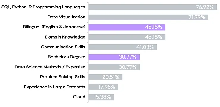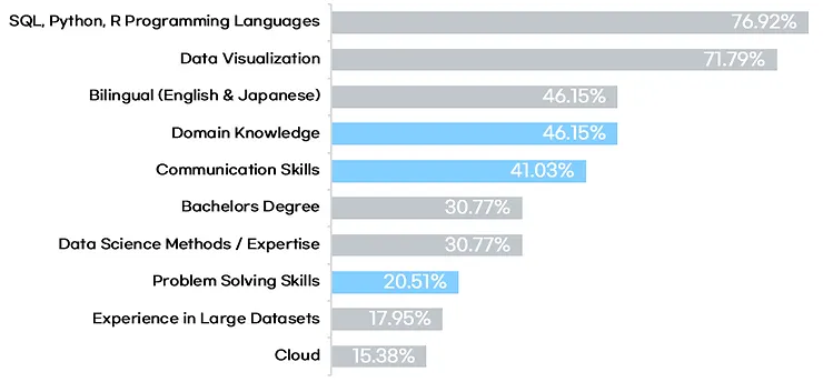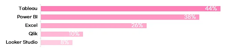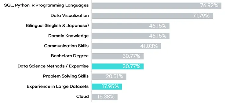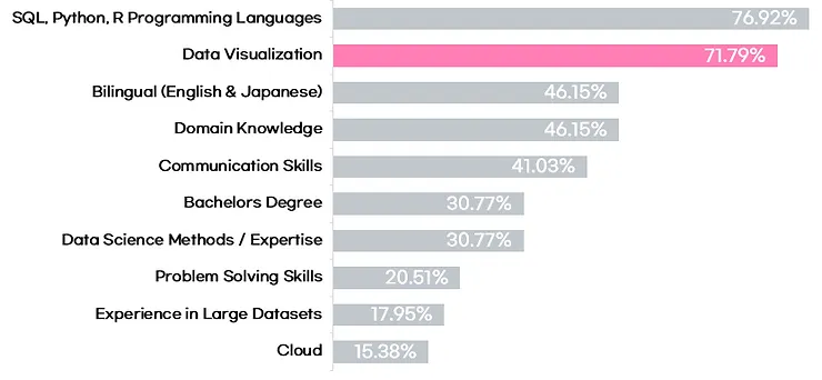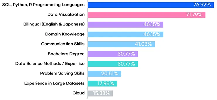 While the companies demanded different visualization skills, Tableau was required the most and followed by Power BI, Excel, Qlik, and Looker Studio.